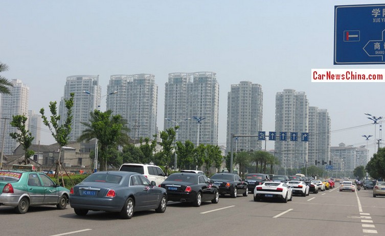 An amazing Super Car Wedding™ in the great city of Wenzhou in Zhejiang Province. [super car wedding: wedding where a wealthy Chinese super-car owning couple invites all their super-car owning friends for the party which mostly includes a vanity ride through town] The Wenzhou wedding counted about 25 super cars, including two Ferrari F12berlinettas and ten Rolls-Royce Phantoms. The camera car is a Porsche Cayenne.